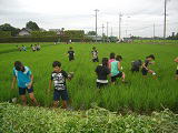 この日、子どもたちは裸足で田んぼに入り、カエルやアメンボなどを捕えるなど、生きた自然との触れ合いを楽しみました。