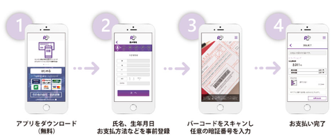 「PayB」による納付手続は、スマートフォン決済アプリを用いて、納付書のバーコードを読み取り、登録した預貯金口座から即時にお支払することで行います。