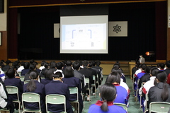 講座では、市議会をより身近に感じていただき、地方議会に対する興味や関心を持ってもらうことを目的に、議会改革特別委員会の柳沢暁委員長、斉藤万紀子副委員長、野中一城委員、増田敏雄委員が出席し、2年生の生徒を対象に、市議会の仕組みや役割、政治に関心を持ってもらうことなどの説明とともに、事前アンケートに対する回答を行いました。