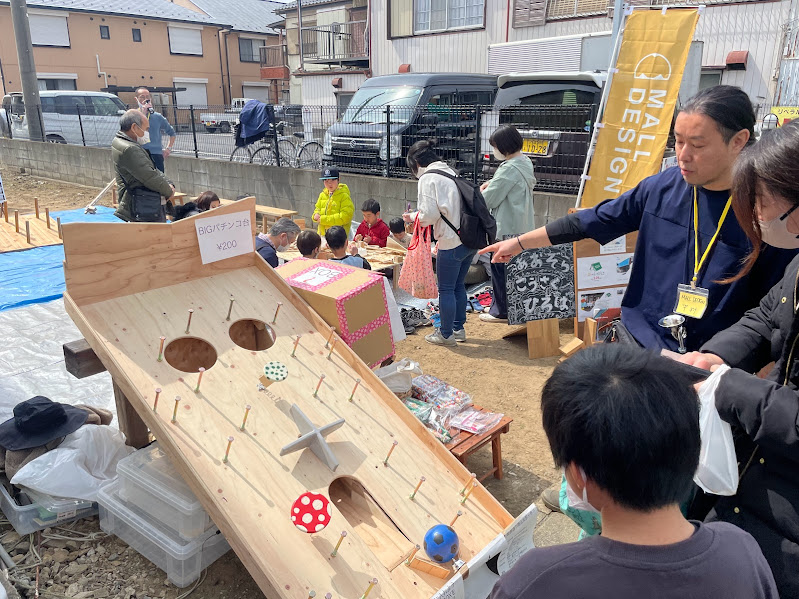 ▲空き地のオーナーとの協力関係を構築、清掃後木工体験を開催。ゲームの景品には、商店街で1か月間使えるチケットなどを作成。