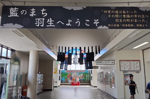 東武鉄道羽生駅のトイレリニューアルにあわせて、羽生市藍染振興協議会ご協力のもと、駅自由通路に藍染作品を展示いたしました。様々な藍染作品の装飾で、皆さまをお迎えしております。