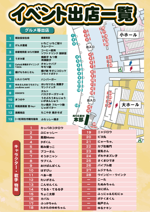 キャラクター名 公表地域名 ブース番号 たかたのゆめちゃん 岩手県陸前高田市 13 ニャジロウ 秋田県秋田市 14 ふぅにゃ&むむにゃ 栃木県小山市 20 はすぴぃ 埼玉県蓮田市 3 ふっかちゃん 埼玉県深谷市 6 にゃーちゃ、 埼玉県 2 べるーにゃ 埼玉県上尾市 9 ブコーさん 埼玉県横瀬町 8 そうかニャン 埼玉県草加市 19 ポテくまくん 埼玉県秩父市 7 ウインビ― 埼玉県戸田市 10 ウインク 埼玉県戸田市 10 松戸さん 千葉県松戸市 12 ふにゃっしー 千葉県船橋市 21 ふなごろー 千葉県船橋市 22 ちょこ太郎 東京都 多摩市 1 べあ~君 東京都千代田区丸の内 18 スフィア 東京都品川区 17 たぬみちゃん 徳島県小松島市 11 ホヌッピー アメリカ合衆国ハワイ州 16 ムジナもん 羽生市 23 いがまんちゃん 羽生市 23 出演アーティスト
