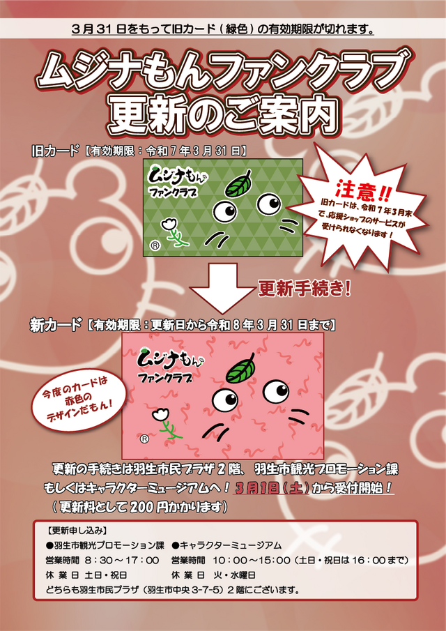 羽生市観光プロモーション課またはキャラクターミュージアムで受付中!