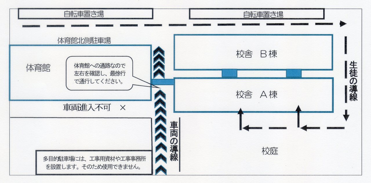 また、保護者の皆様が御来校の際は、なるべく自転車を御利用いただき、自動車で来校される場合は、敷地内を最徐行の上、生徒の往来に十分注意して通行くださいますようお願い申し上げます。