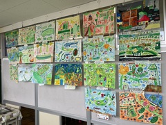 廊下にはそれぞれの学年が描いた絵の作品が展示しています。校内絵画展は来月3日(月)~7日(金)です。