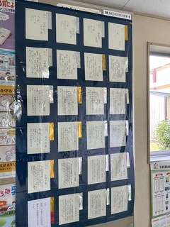 職員室前の廊下に硬筆を展示しています。