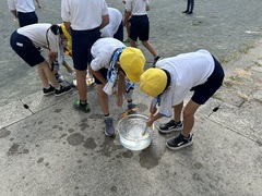 学習の終盤には、実験キットを使い水鉄砲をしました。