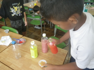 2年生が、絵の具を使って色水をつくっています。色を混ぜて、不思議な色水やきれいな色水、思わず飲んでしまいそうな美味しそうな色水をつくりました。そして、色水が入った透明な容器を並べて、遊びを思いつきました。