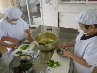 1学期のまとめとして、わかば・わかくさ学級では、学級園で収穫した夏野菜を使ってカレーを作りました。協力して、野菜を洗ったり食べやすい大きさに切ったりしました。毎朝水やりをしたり実はなっているか観察したりしてお世話をしてきた野菜はとてもおいしかったです。