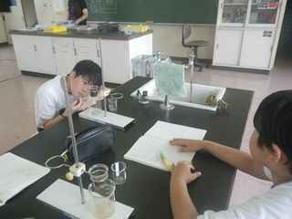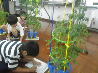 2年生は、ミニトマトを育てています。ミニトマトの苗の背丈は、自分の身長に近づいてきました。真っ赤なミニトマトが次々と実り始め、今日は、ミニトマトを収穫しました。夏休み中も、持ち帰って育てます。