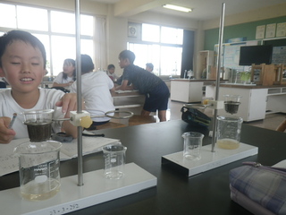 4年生は、雨水の流れ方や水のしみこみ方について学習しています。今日は、土と砂ではしみこみ方はどのように違うのか実験しました。時間を測ってみると、粒の大きい砂の方が速くしみこむことがわかりました。
