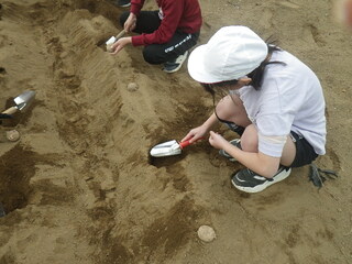 5年生が、地域の方のご協力で整備していただいた学校ファームにじゃがいもの種イモを植えました。来年度の理科や家庭科の学習で使う予定です。