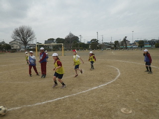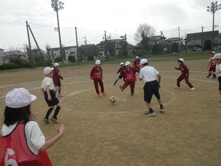 2年生が、校庭でドーナツサッカーを行いました。子供達は、どうやったら得点が決まるのか攻め方や守り方の作戦をチームで考えながら、ゲームを行いました。