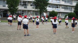 今朝は赤組、白組それぞれにわかれて並び、応援の練習を行いました。並ぶ位置の確認や「ゴーゴーゴー」の歌をみんなで歌いました。
