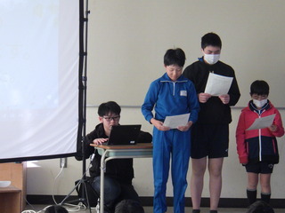 公開日 2026年01月27日 更新日 2026年01月27日 マルチルームで児童集会を行いました。今日の担当は環境委員会です。環境委員会の仕事内容や本校で飼育しているウサギに関するクイズを出してくれました。
