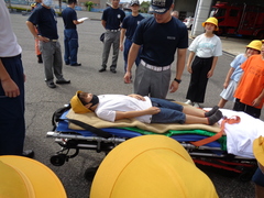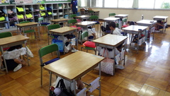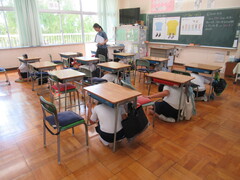 地震が起きたときの第一動作の訓練を行いました。これまでの訓練も生かされ、スムーズに身を守る動作ができました。