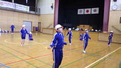本日は体育館で行いました。運動委員会の児童がステージの上で見本となってくれました。