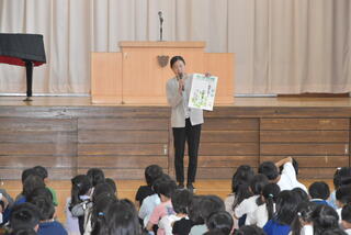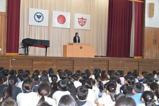 今日の集会は校長の話と生活目標の話でした。校長から「丁寧な言葉を使おう」「ふわふわ言葉を広げよう」「順序を考えて話そう」という話がありました。その後、担当から5月の生活目標「時間を守って行動しましょう」の話がありました。