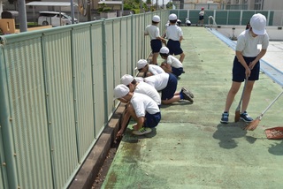 いよいよ水泳学習の季節がやってきました。3年生以上の児童が分担を決めてプール清掃をしました。3・4年生はプールサイドの掃除などを、5・6年生はプールの中の掃除などをしました。みんなで力を合わせて掃除をしたので、プールがとてもきれいになりました。