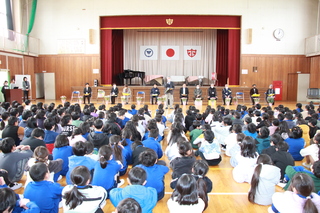 埼玉県警察音楽隊が須影小学校に来てくださいました。クラッシックの名曲だけでなく、となりのトトロの挿入歌「さんぽ」や名探偵「コナン」の主題歌、ミセスグリーンアップル「ライラック」などを演奏してくださいました。そして、須影小学校校歌を県警音楽隊の演奏に合わせてみんなで歌いました。途中から演奏に合わせて、カラーガード隊の旗の演技を見ました。フラッグを自由自在に操り、とてもかっこよかったです。